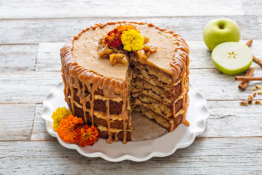 To a base of organic Granny Smith apples, organic flour and organic sugar, I add in antioxidant-rich, anti-inflammatory cinnamon and turmeric, to create flavorful spice cake layers. Then, I carefully whip a base of house-made caramel sauce, whole butter and a touch of cream cheese for a perfectly balanced and uniquely Urban Plates Caramel Buttercream.