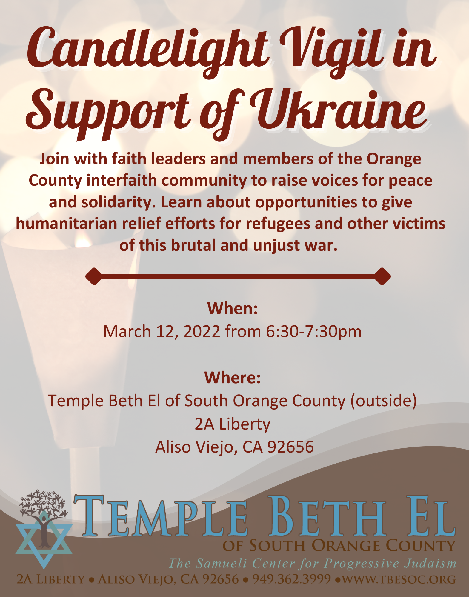 Our community has been overwhelmed with disbelief over the inconceivable and heart breaking news of the recent events taking place in the Ukraine. In an effort to keep front and center attention on this ever evolving situation, we are holding a community wide candle lighting vigil in solidarity and support of the Ukrainian people, this Saturday, March 12 from 6:30-7:30 pm.