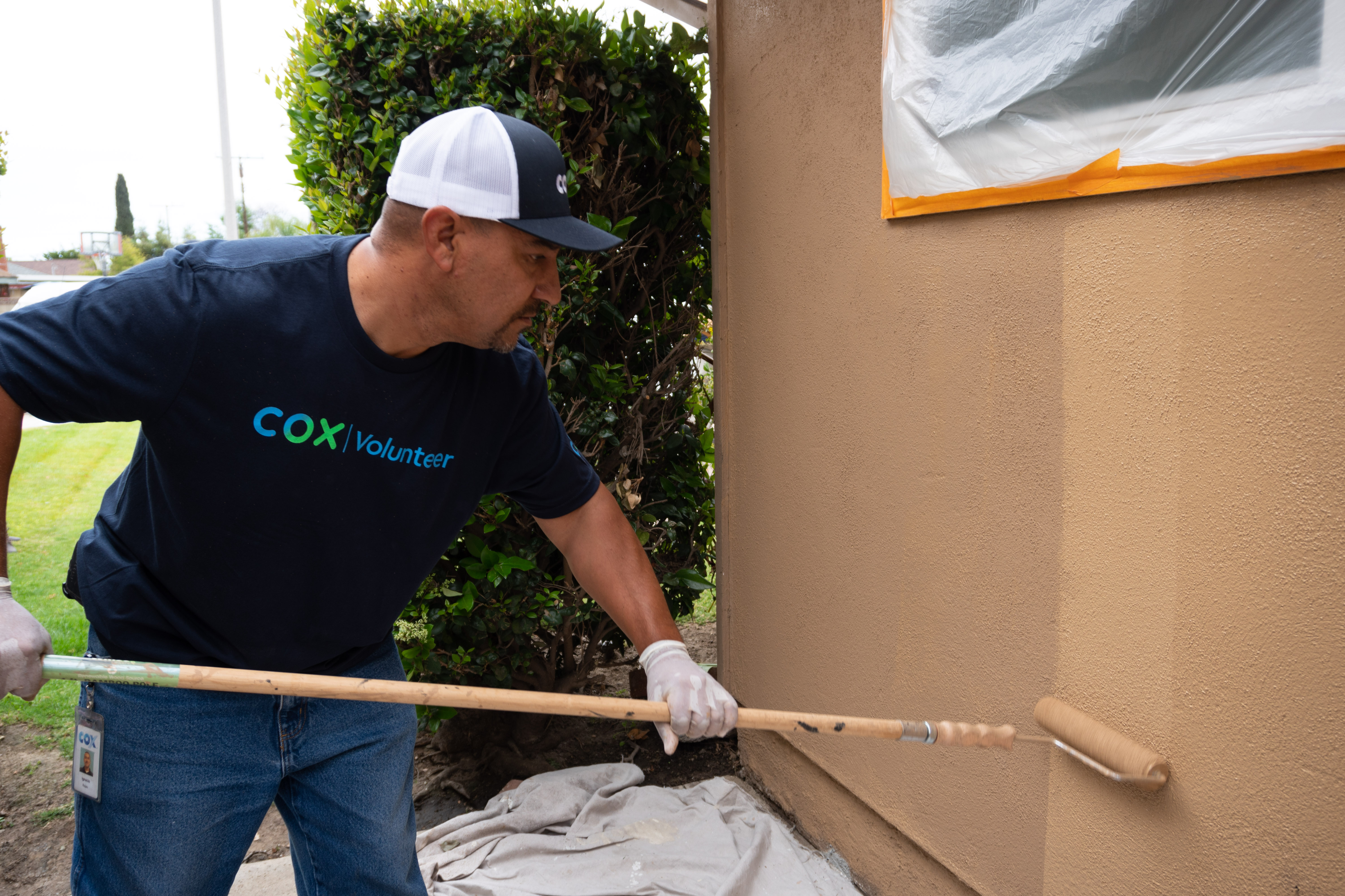 Cox volunteers painted the exterior of U.S. Marine Corps veteran Barry Simons’ home and replacing damaged fascia boards near the rafters, a broken garage door, damaged posts for the patio cover, wood siding, and rafter tails. They also repaired Simon’s patio cover and window frames.