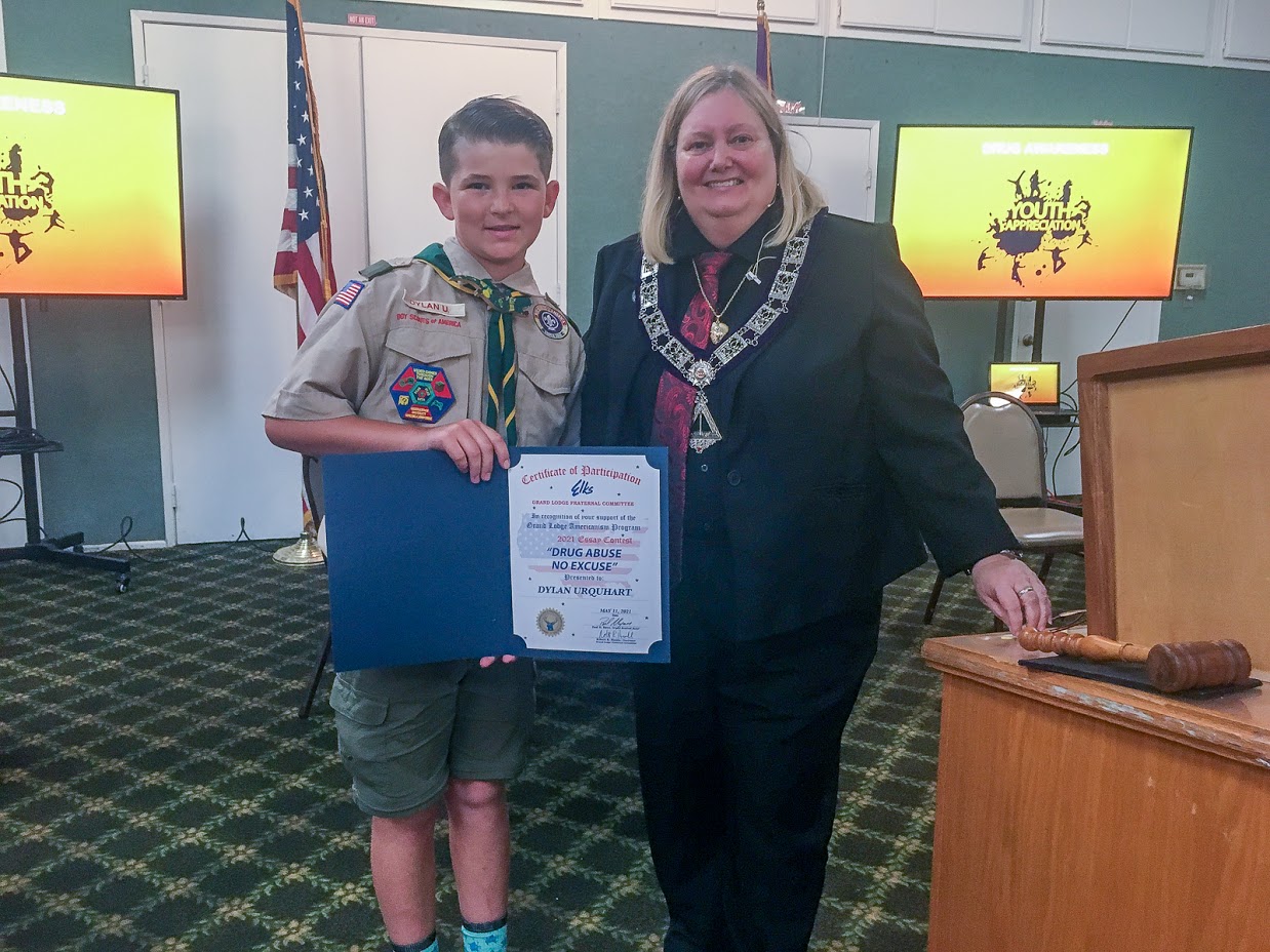 Dylan Urquhart was the winner of the 2021 Drug Awareness and Grand Lodge Americanism Essay Contest titled “Drug Abuse, No Excuse”.  Hoop shoot participants recognized were Dylan Urquhart and District Winner (12-14) Jack Gerken.  In addition, Youth Volunteerism recognition certificates were presented to Dylan and Logan Urquhart, Eli Johnston, Nate Nuelle, Chase Parkan, and Dylan Moscoso.  Eli, Nate, Chase and Dylan Moscoso were servers at the Elk’s recent Inaugural Ball.